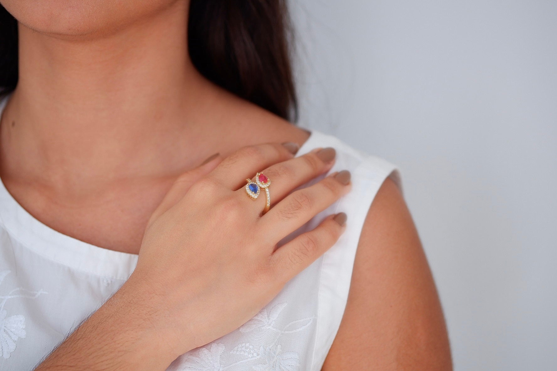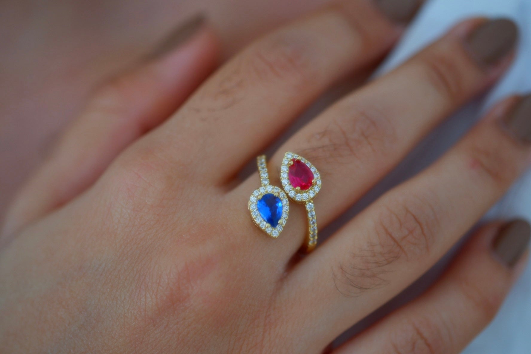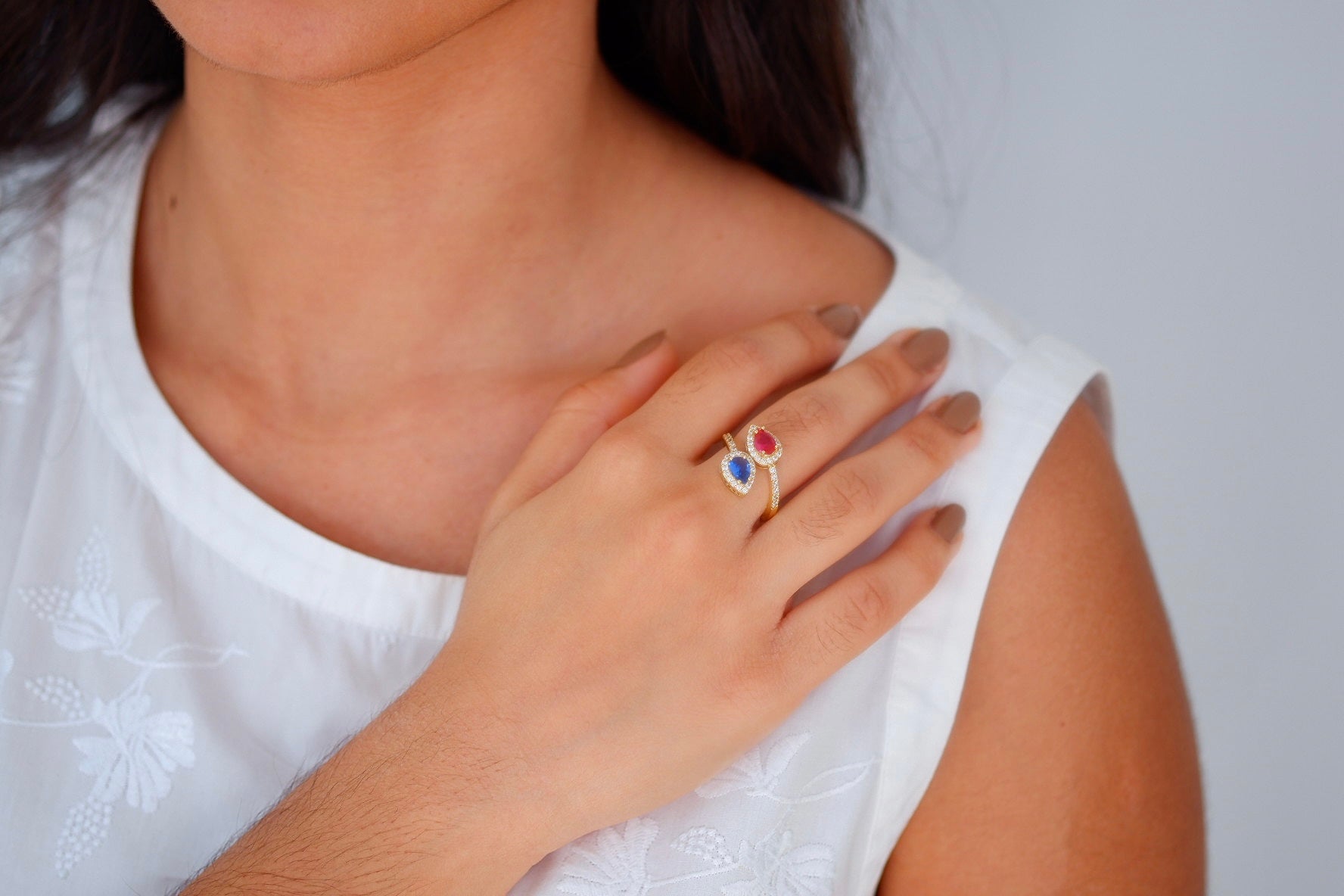 Anillo con dos zirconias principales, una azul y otra fucsia, creando un contraste vibrante y moderno. Delicado, colorido y perfecto para destacar tu estilo.