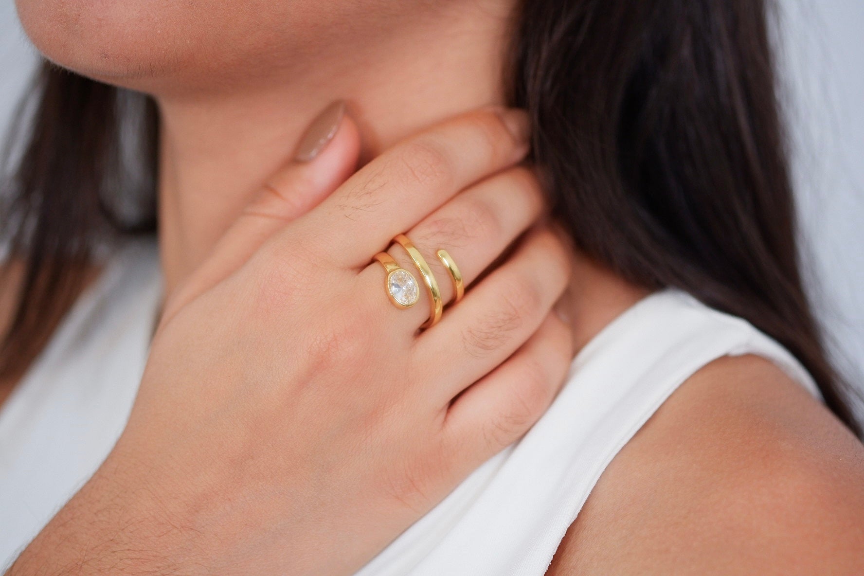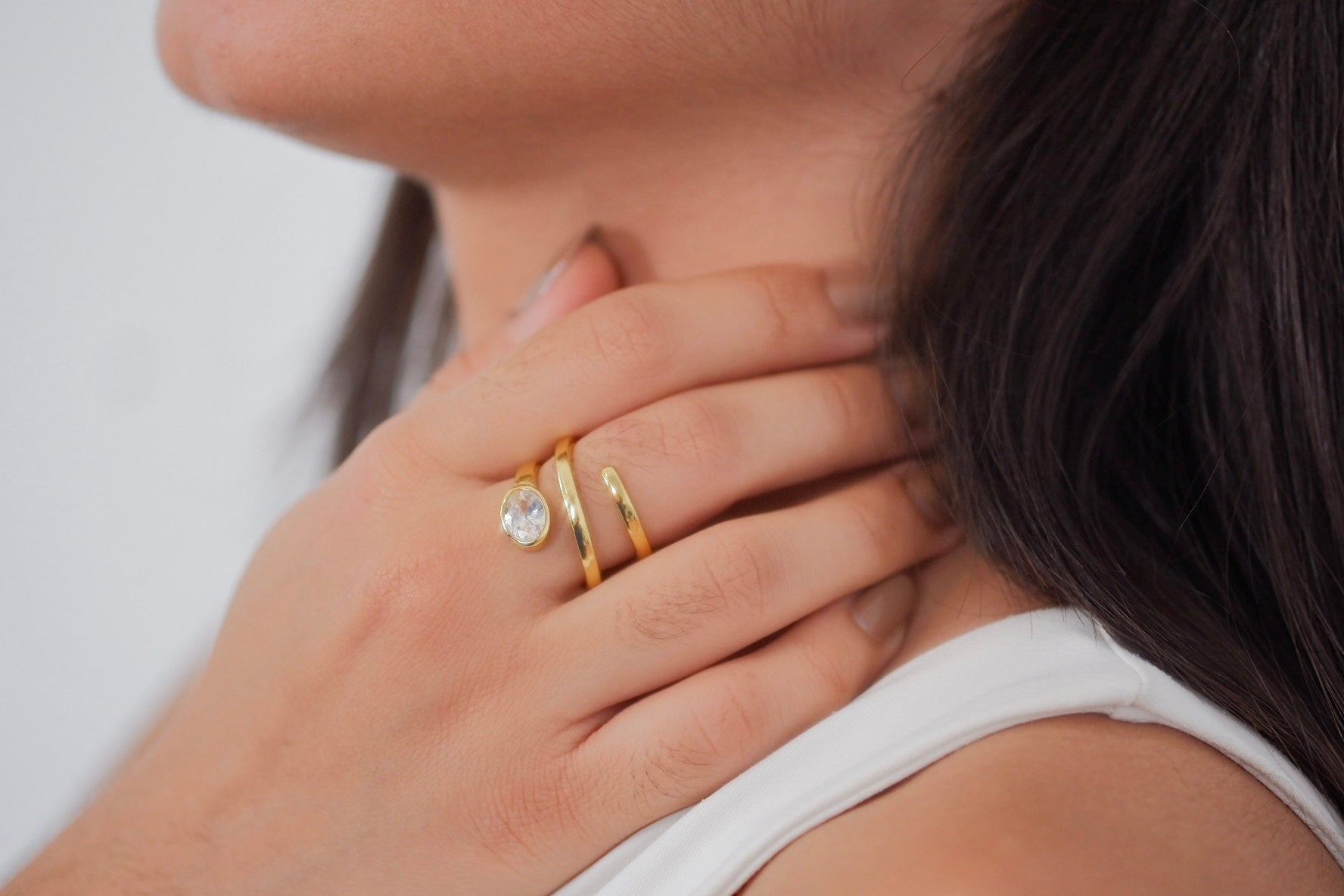 Anillo de varias vueltas adornado con una zirconia que aporta brillo y elegancia. Un diseño moderno y delicado que destaca por su estilo sofisticado.