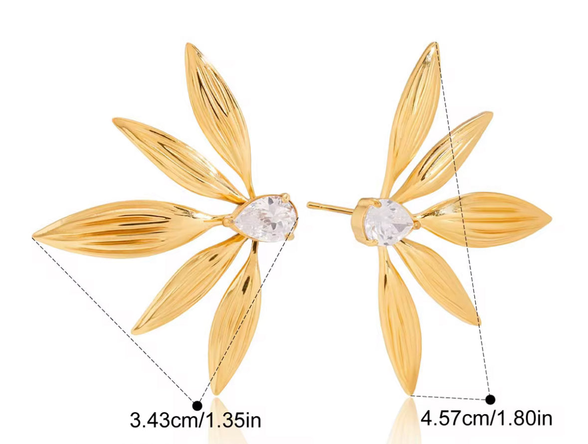 Aretes dorados con un diseño de media flor, delicadamente trabajados y realzados con una zirconia brillante en el centro. Su estilo femenino y luminoso los hace perfectos para añadir un toque de elegancia a cualquier ocasión.