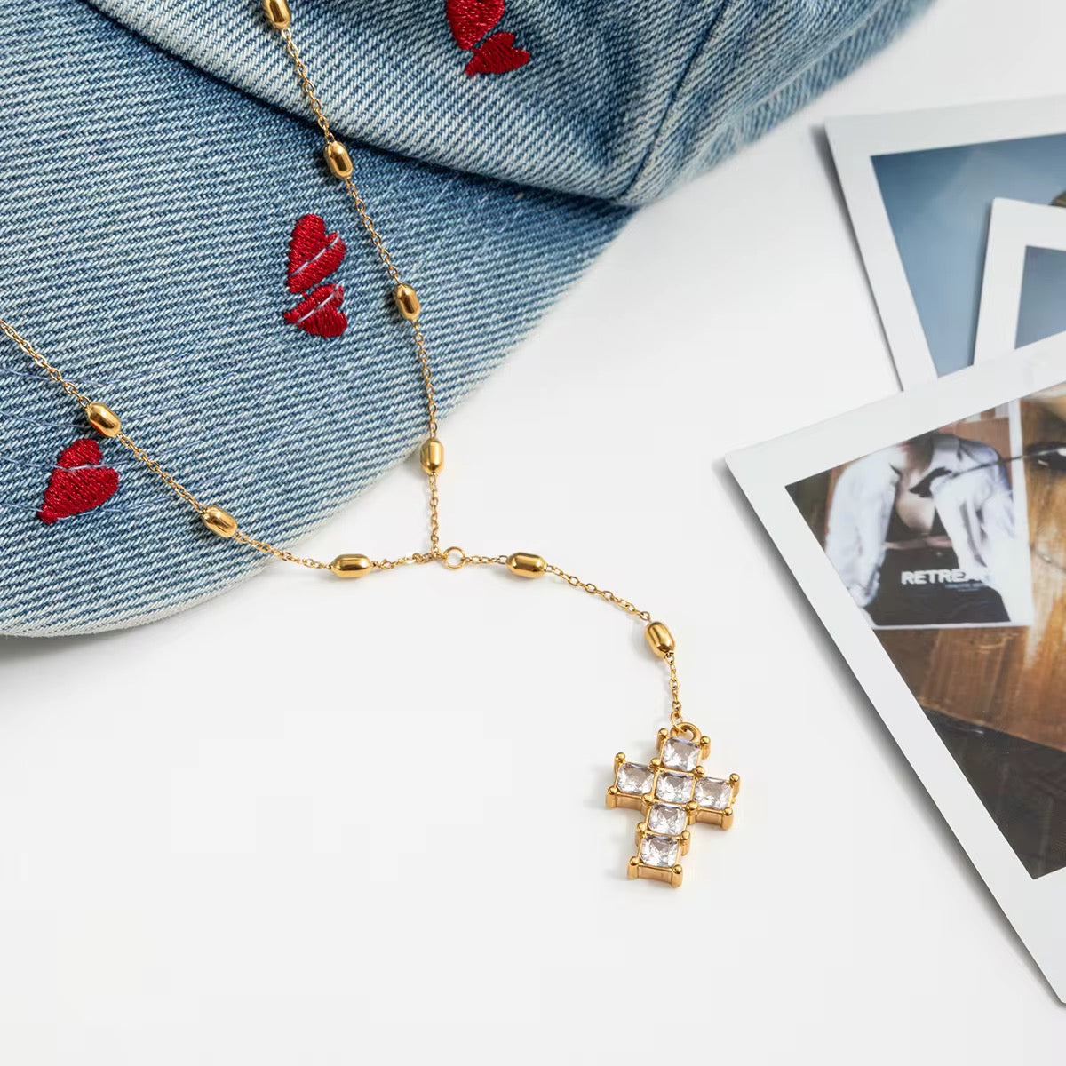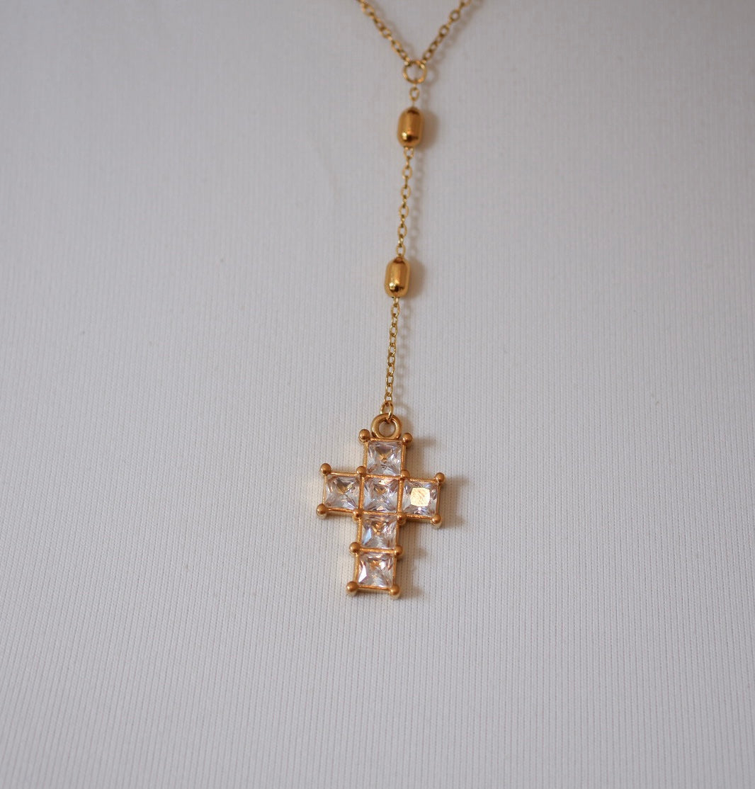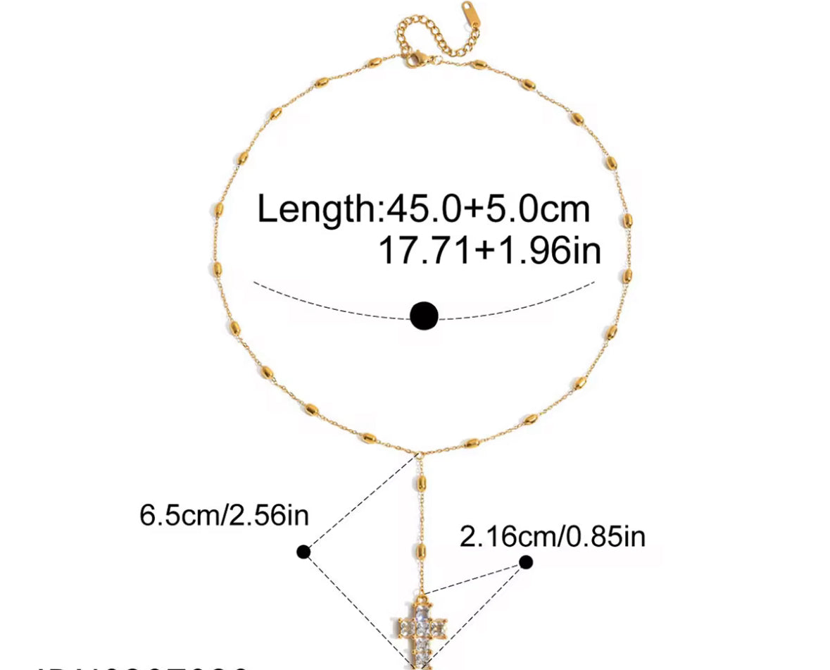 Elegante, moderno y con un toque de brillo sutil. Este collar tipo corbatín cae delicadamente y termina en una cruz adornada con zirconias que capturan la luz de forma hermosa. Su diseño alargado estiliza el cuello y añade un aire sofisticado y femenino a cualquier look.