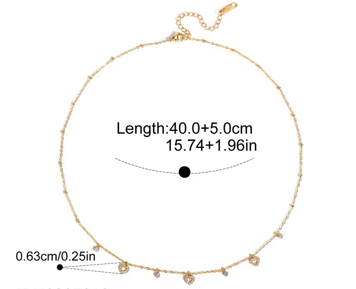 Dale un toque delicado a tu estilo con este collar finito con corazoncitos en zirconias. Ideal para usar solo o combinar con otras cadenas, aporta un brillo sutil y romántico que complementa cualquier look. Perfecto para regalar o consentirte a ti misma.