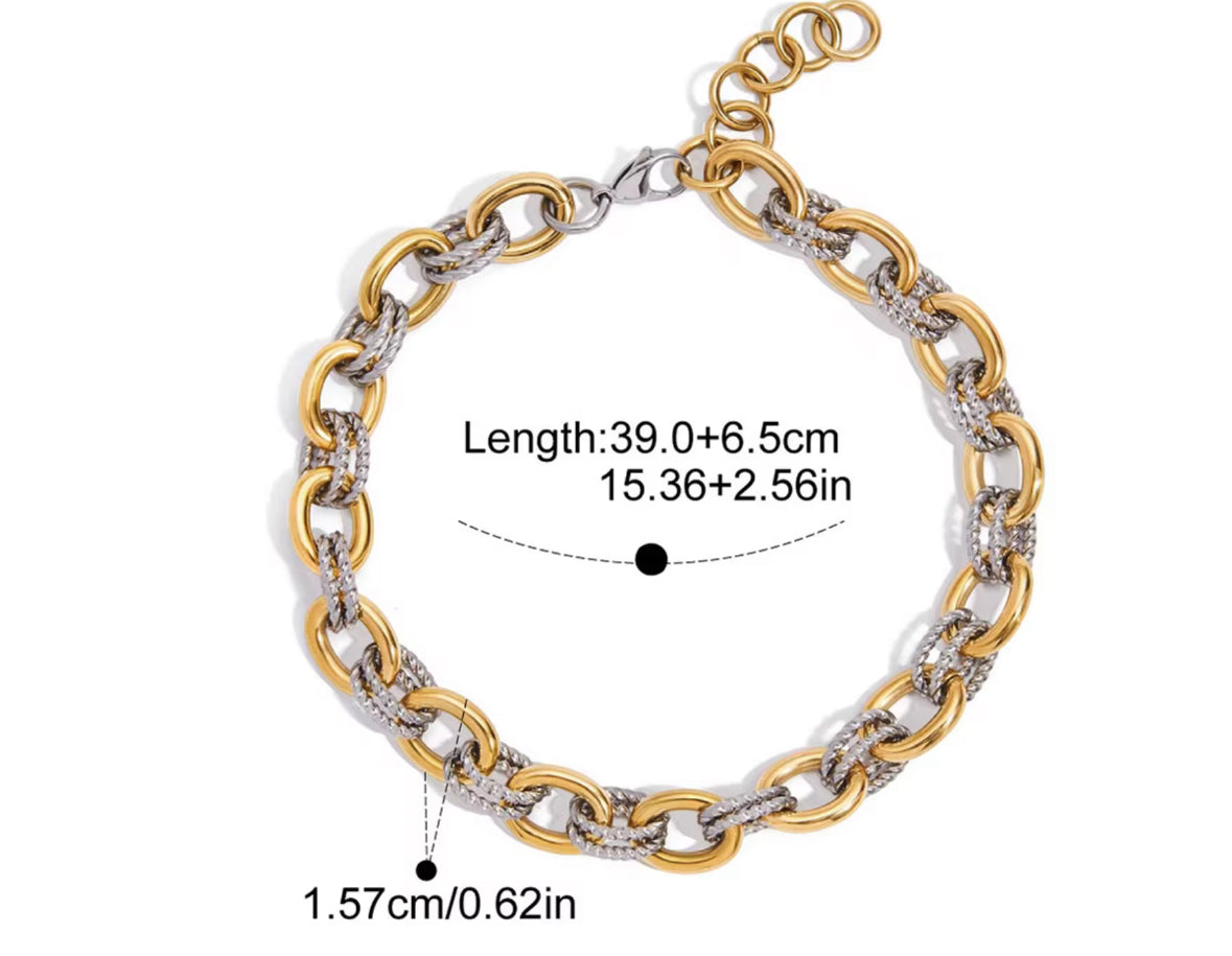 Dale un toque de estilo moderno a tu look con este collar de eslabones gruesos en dorado y plateado. Versátil y llamativo, perfecto para combinar con cualquier outfit y destacar con elegancia en cualquier ocasión.