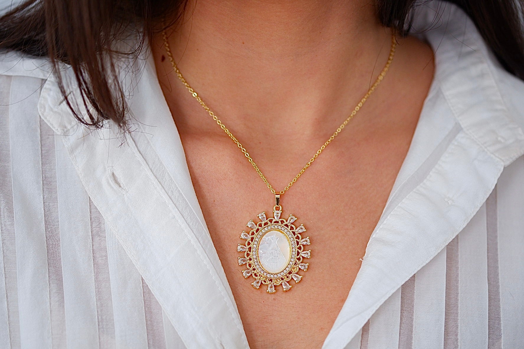 Este collar resalta por su diseño radiante y profundamente significativo. Su dije ovalado presenta la imagen de la Virgen, delicadamente enmarcada por un halo de piedras en forma de lágrima que crean un efecto luminoso y celestial.