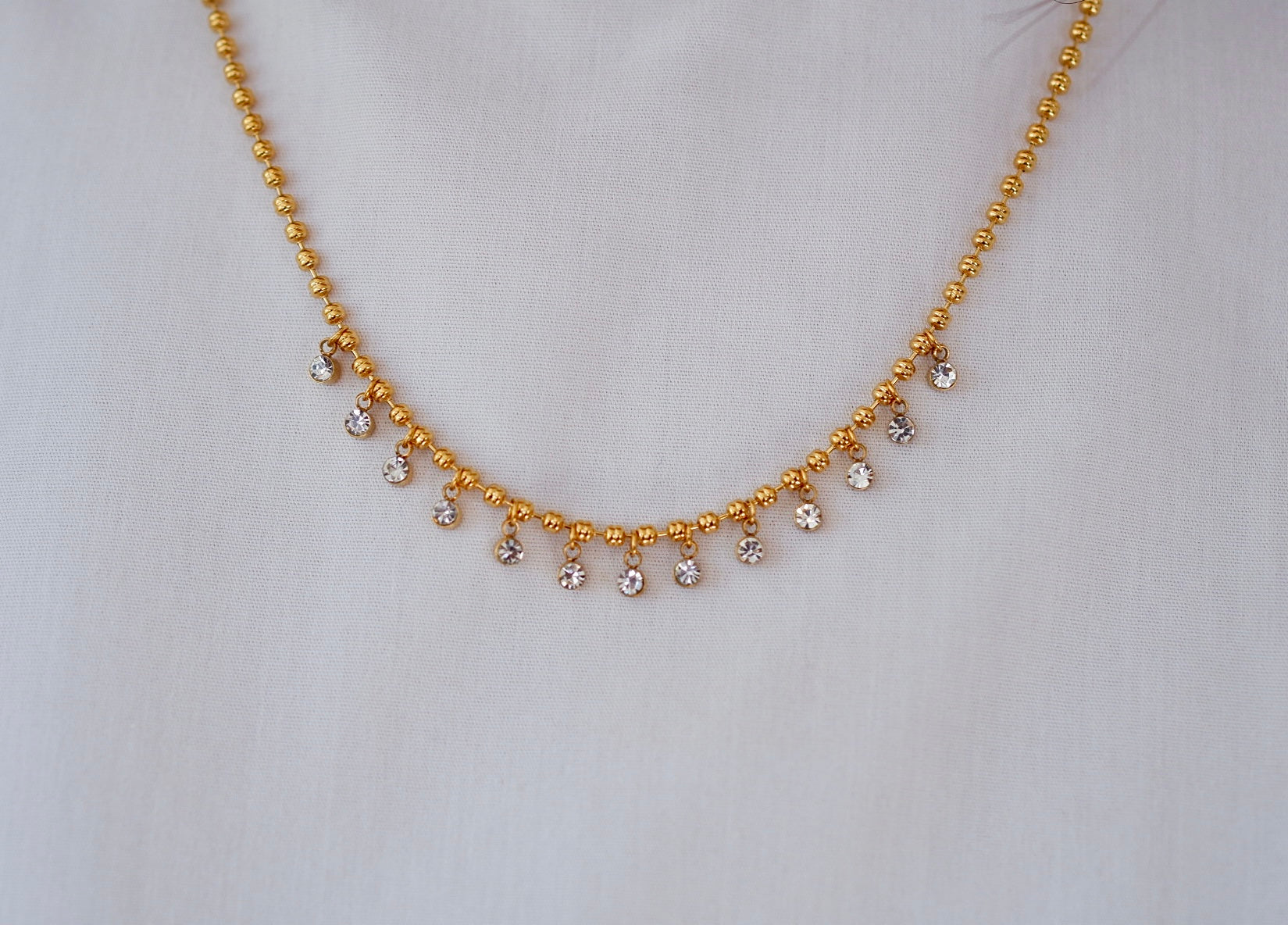 Collar finito con delicadas zirconias pequeñitas colgando a lo largo de la cadena, que aportan un brillo sutil y elegante. Ideal para un look femenino, minimalista y perfecto para usar solo o en layering.