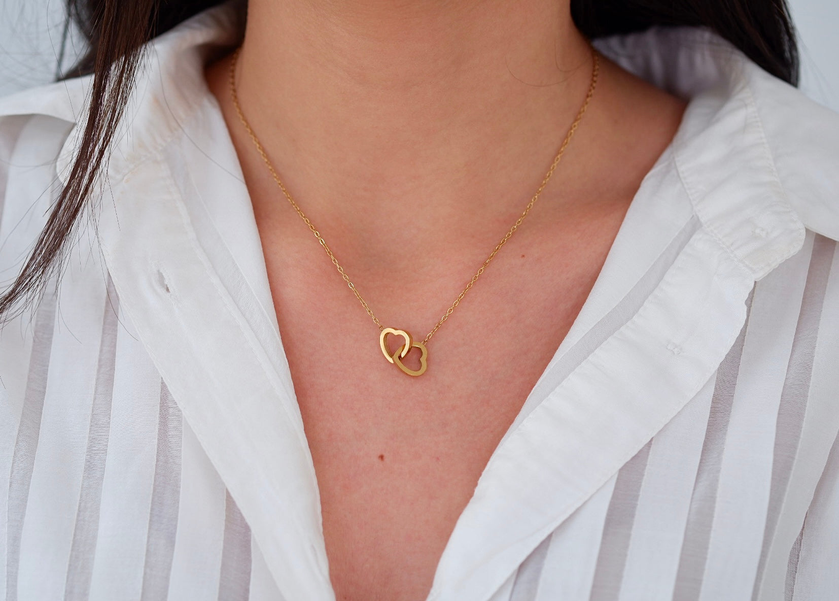 Collar finito con dos corazones delicadamente entrelazados, un diseño que representa unión, complicidad y amor eterno. Sutil y elegante, es perfecto para llevar a diario o regalar como símbolo de un vínculo especial. Una pieza ligera, femenina y llena de significado.