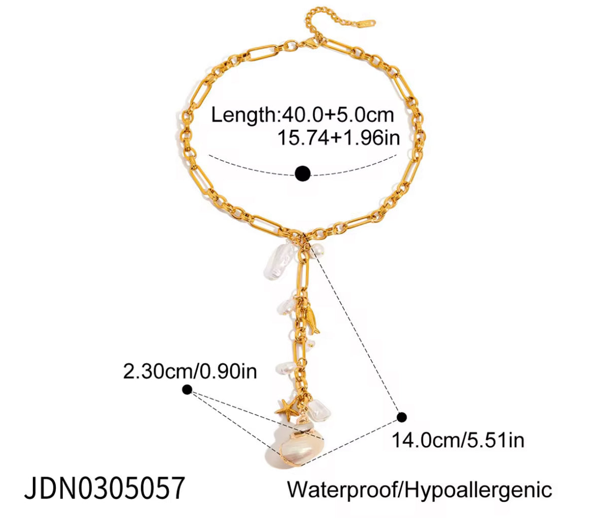 Un diseño único que combina elegancia y un toque playero. El estilo tipo corbatín se adorna con delicadas perlas y caracol colgante, creando un accesorio ligero, versátil y lleno de personalidad.