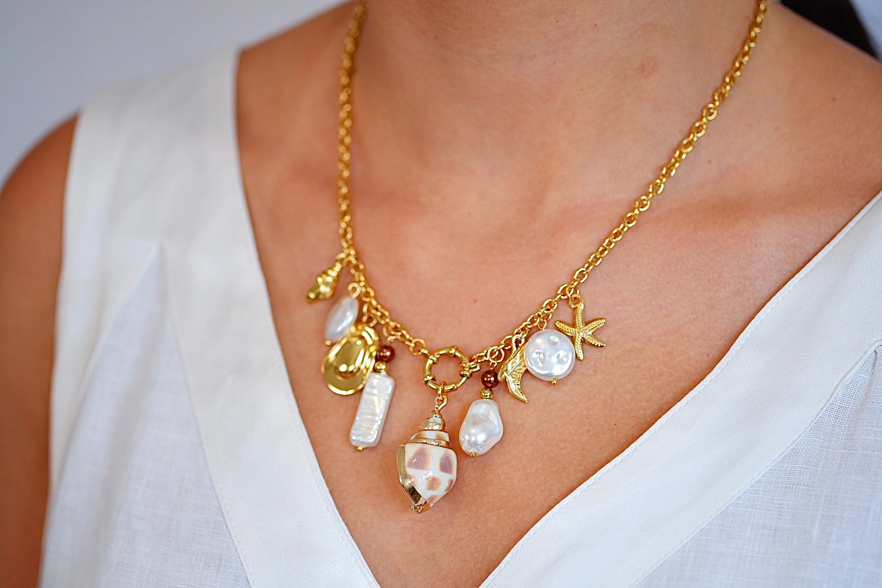 Lleva contigo la magia del mar con este encantador collar marino, una joya que combina la belleza natural de los caracoles con la elegancia atemporal de las perlas.