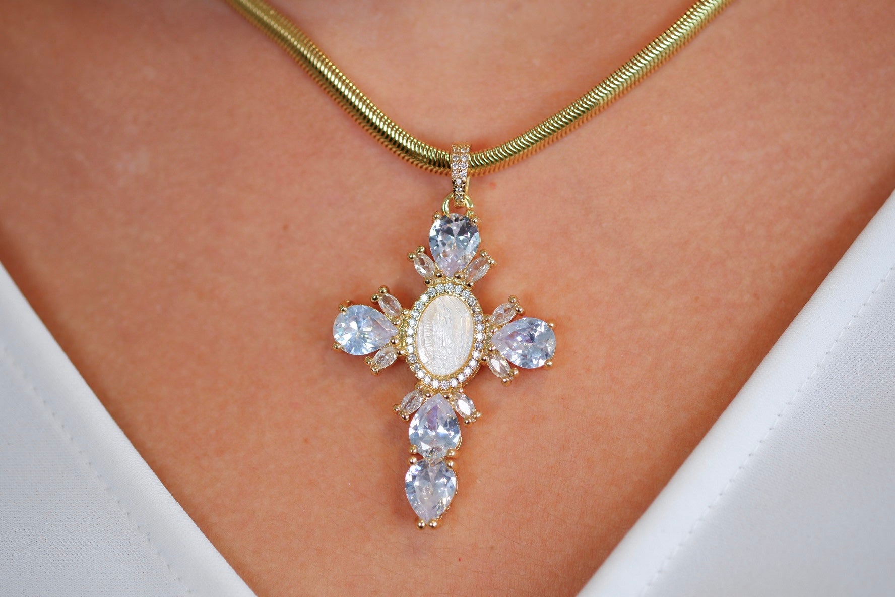 Imponente y lleno de significado, este collar destaca por su cadena gruesa y plana en tono dorado, que aporta fuerza y presencia. El colgante es una cruz brillante con zirconias llamativas incrustadas, y en su centro, una delicada imagen de la Virgen de Guadalupe en nácar, que resalta con luz propia. Una pieza que fusiona espiritualidad, estilo y carácter en un solo diseño.