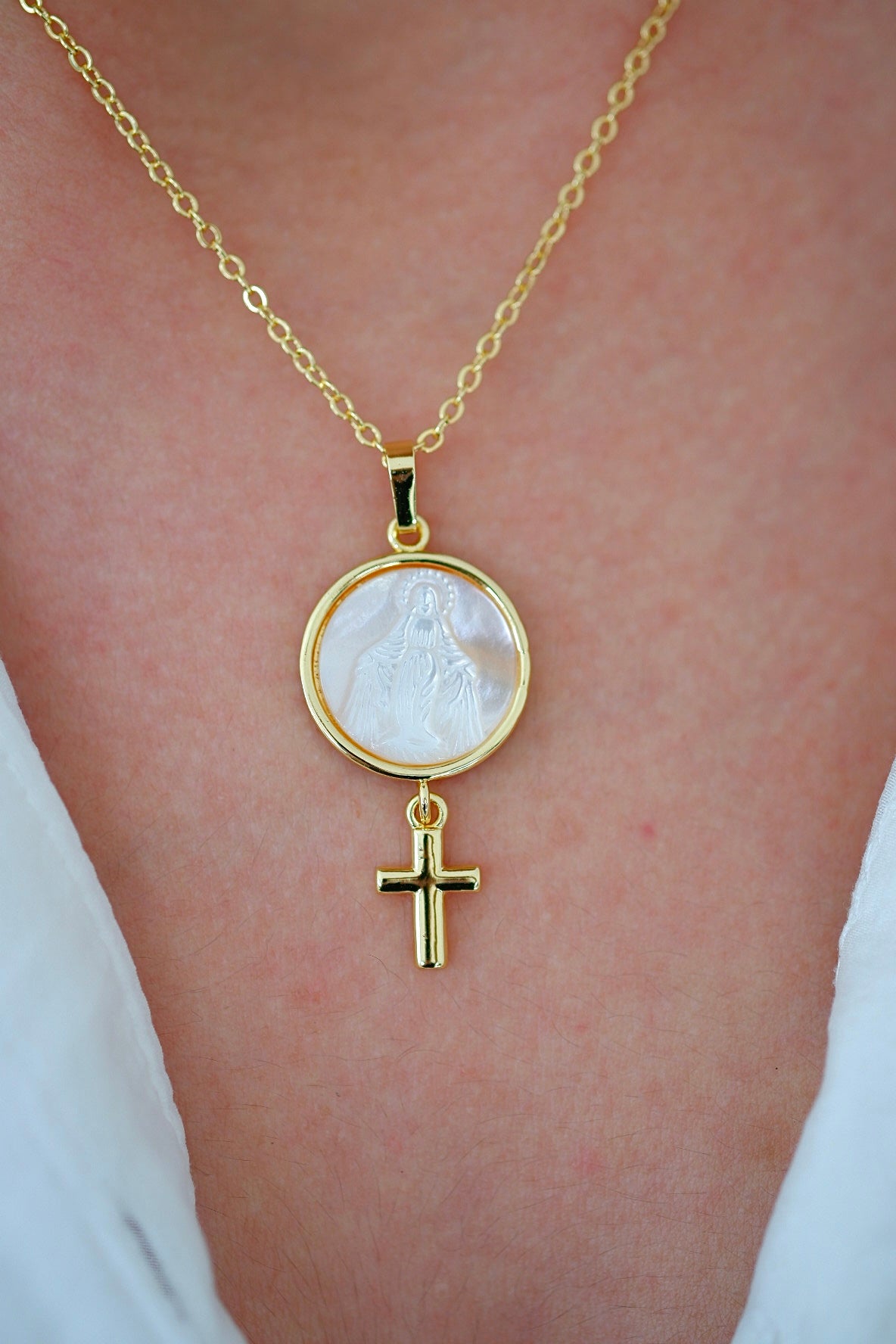 Collar con medalla de la Virgen Milagrosa en nácar, acompañada de una delicada cruz colgante que aporta un significado espiritual profundo. El brillo natural del nácar realza la pieza con elegancia y serenidad, convirtiéndola en un símbolo de fe, protección y devoción. Ideal para llevar a diario o regalar con intención.
