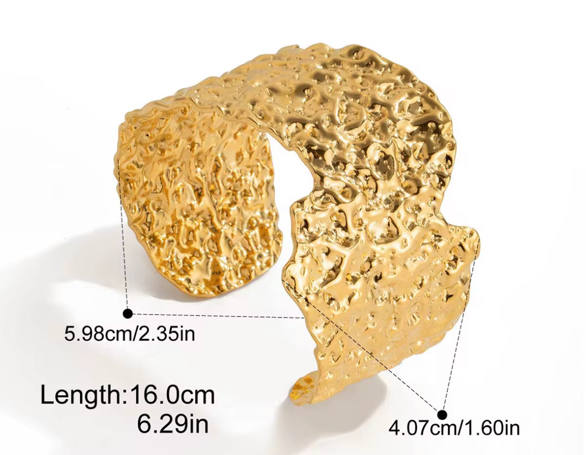 Una pieza imponente y elegante que se convierte en el centro de atención de cualquier look. Esta pulsera ancha en tono dorado aporta un acabado moderno y lujoso, perfecta para darle carácter y estilo a tu outfit.