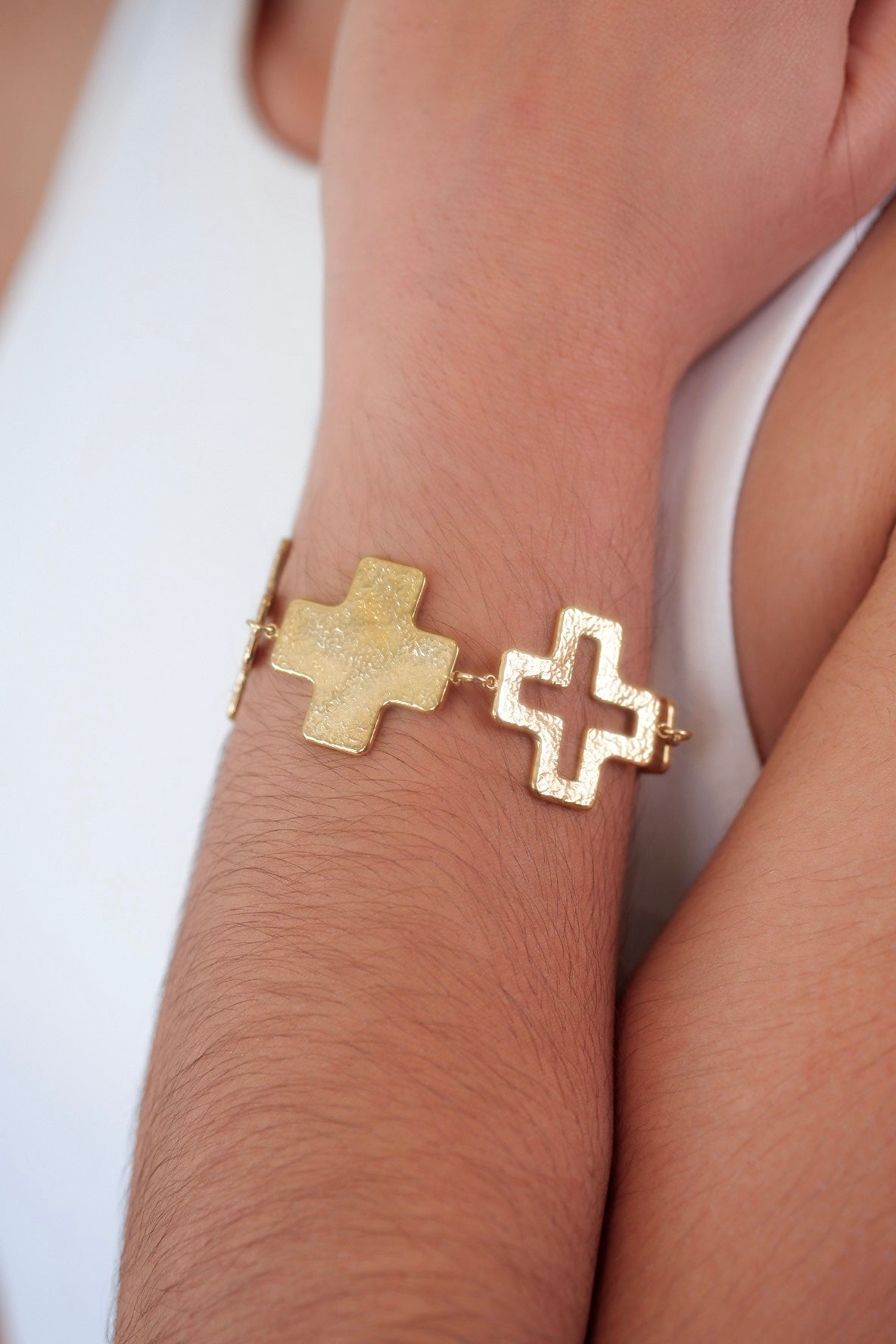 Pulsera llamativa y resistente, elaborada con múltiples cruces doradas que crean un diseño moderno y poderoso. Su acabado brillante destaca en cualquier look, ideal para quienes aman accesorios con presencia y un toque de estilo elegante.