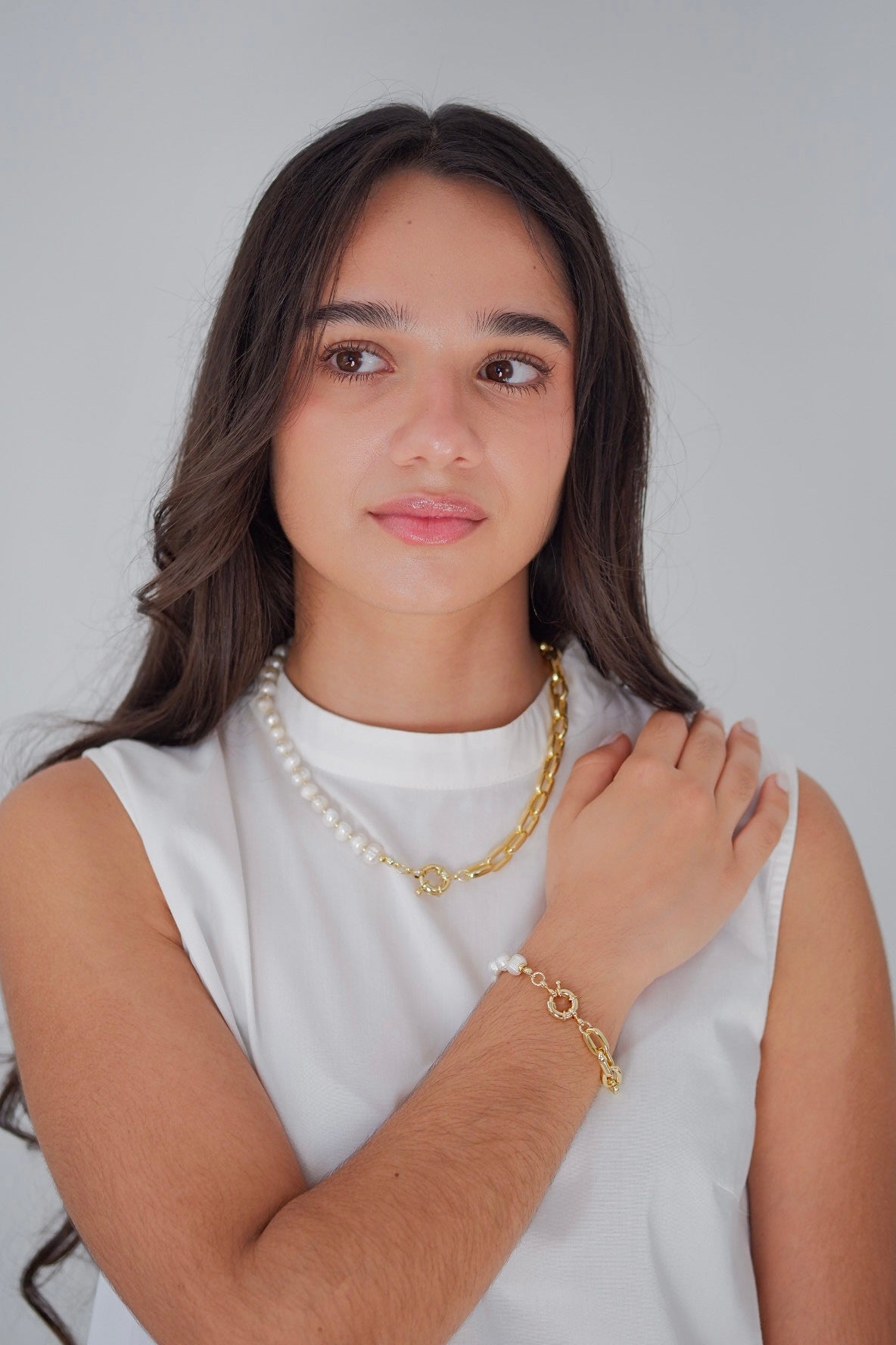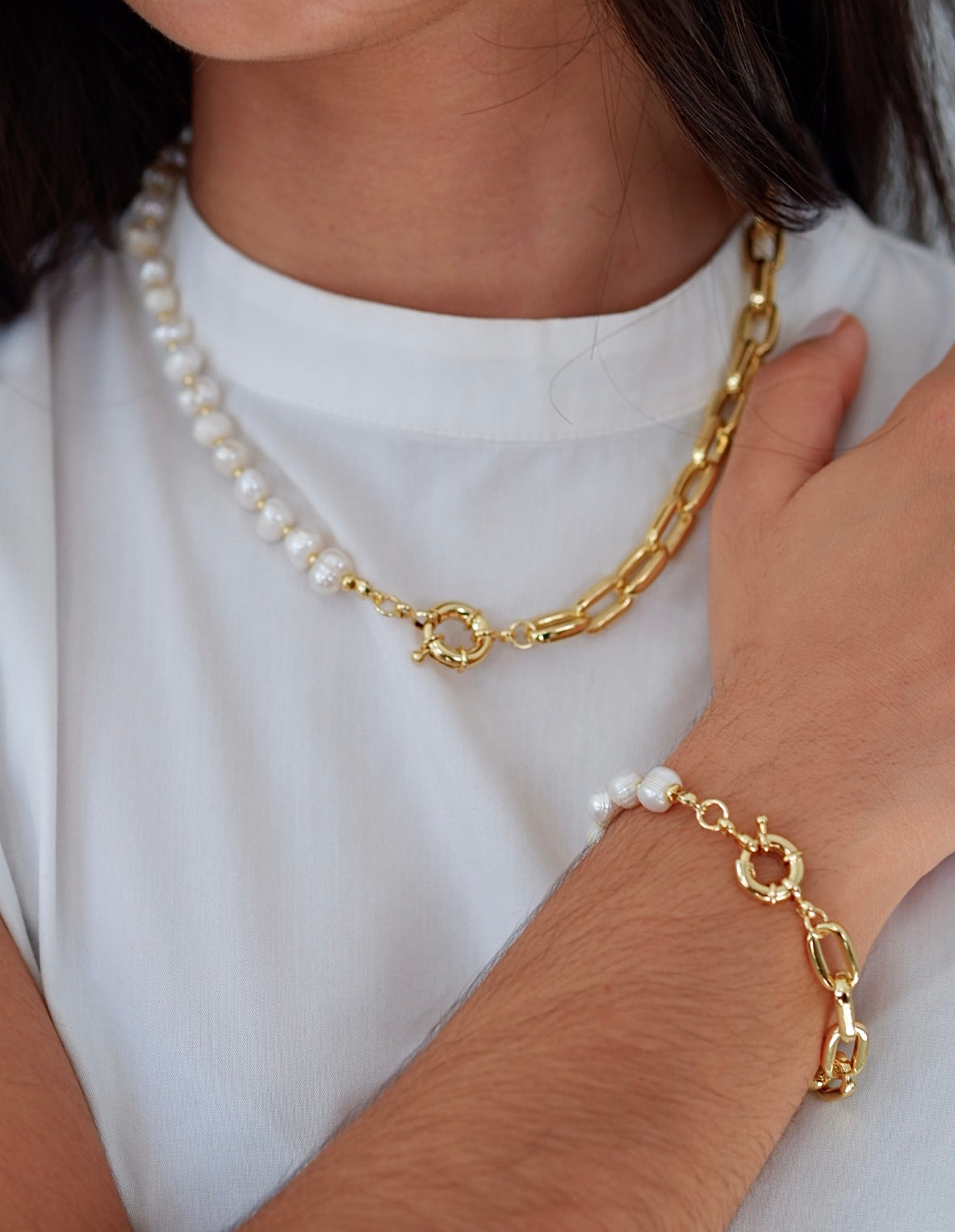 Set de collar y pulsera con diseño moderno de mitad perlas y mitad cadena, que combina lo clásico y lo contemporáneo en una sola pieza. Las perlas aportan elegancia y feminidad, mientras la cadena añade un toque actual y sofisticado.