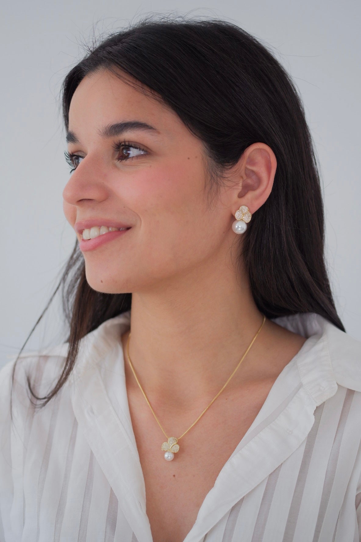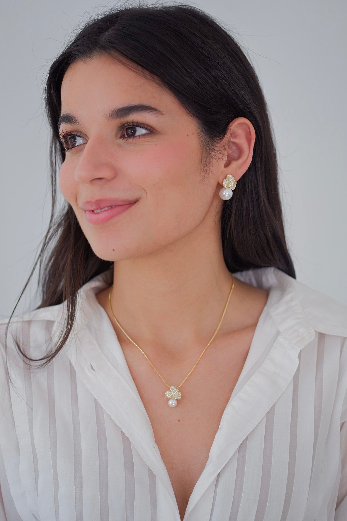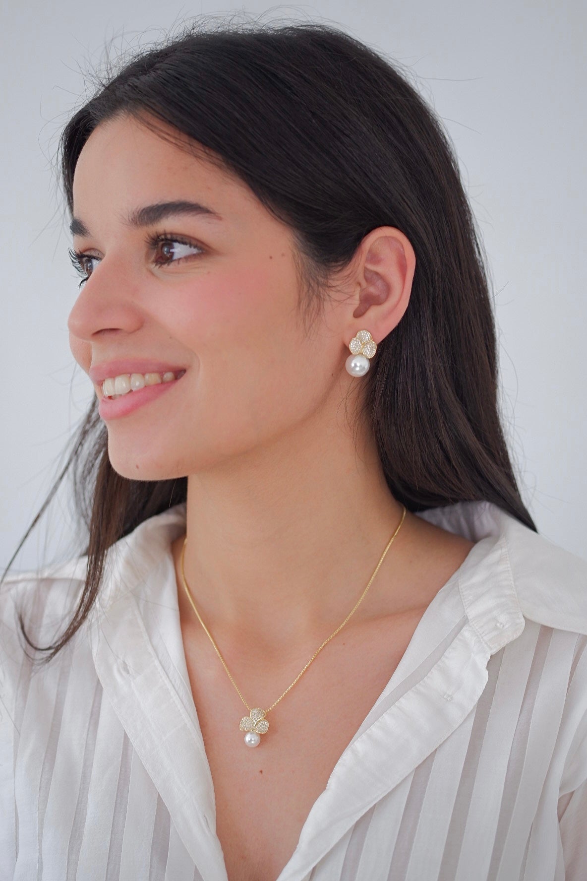 Set de collar y aretes con perla, realzados por delicadas hojitas superiores en micro zirconias que aportan un brillo sutil y sofisticado. Su diseño combina la elegancia clásica de la perla con un toque moderno y femenino, ideal para ocasiones especiales o para elevar cualquier look diario. Un set refinado, romántico y perfecto para regalar.