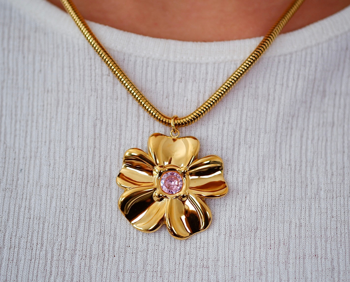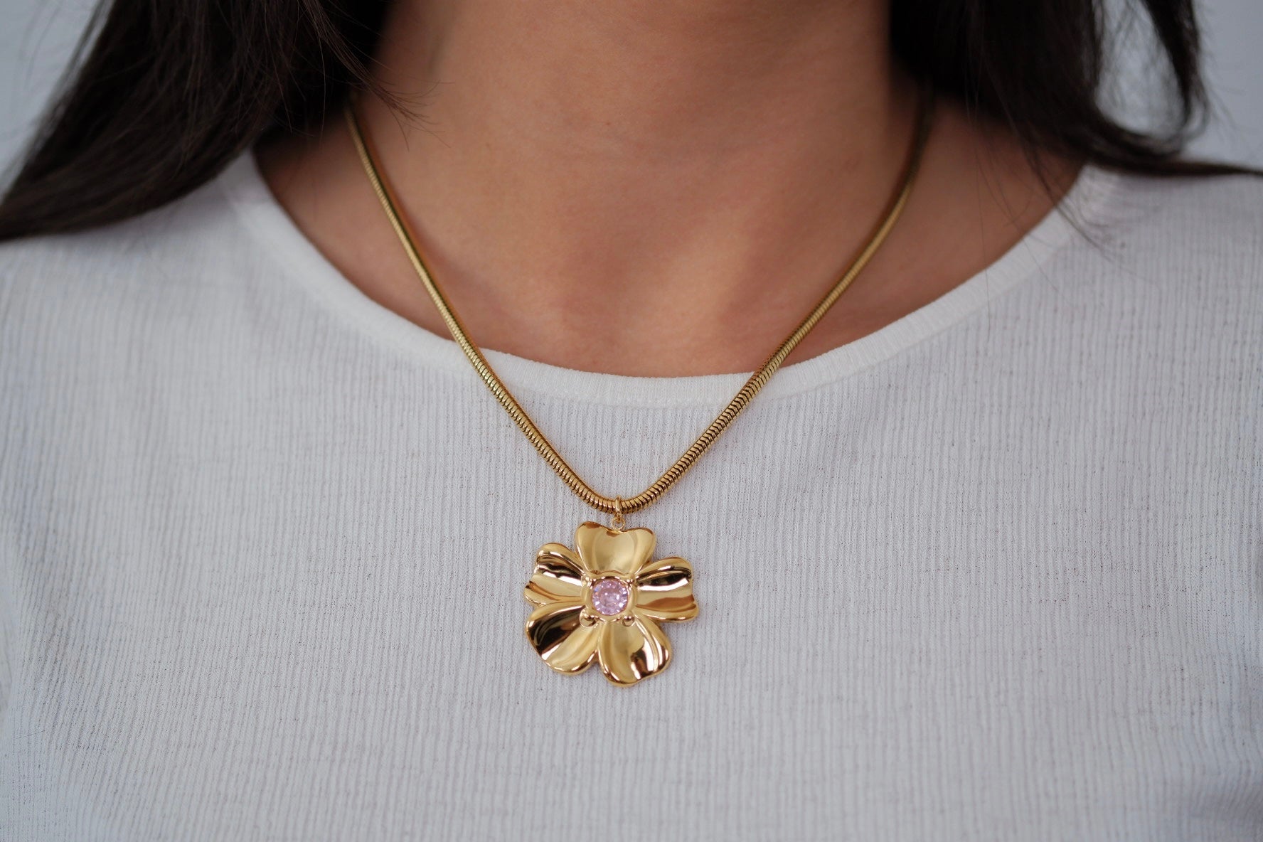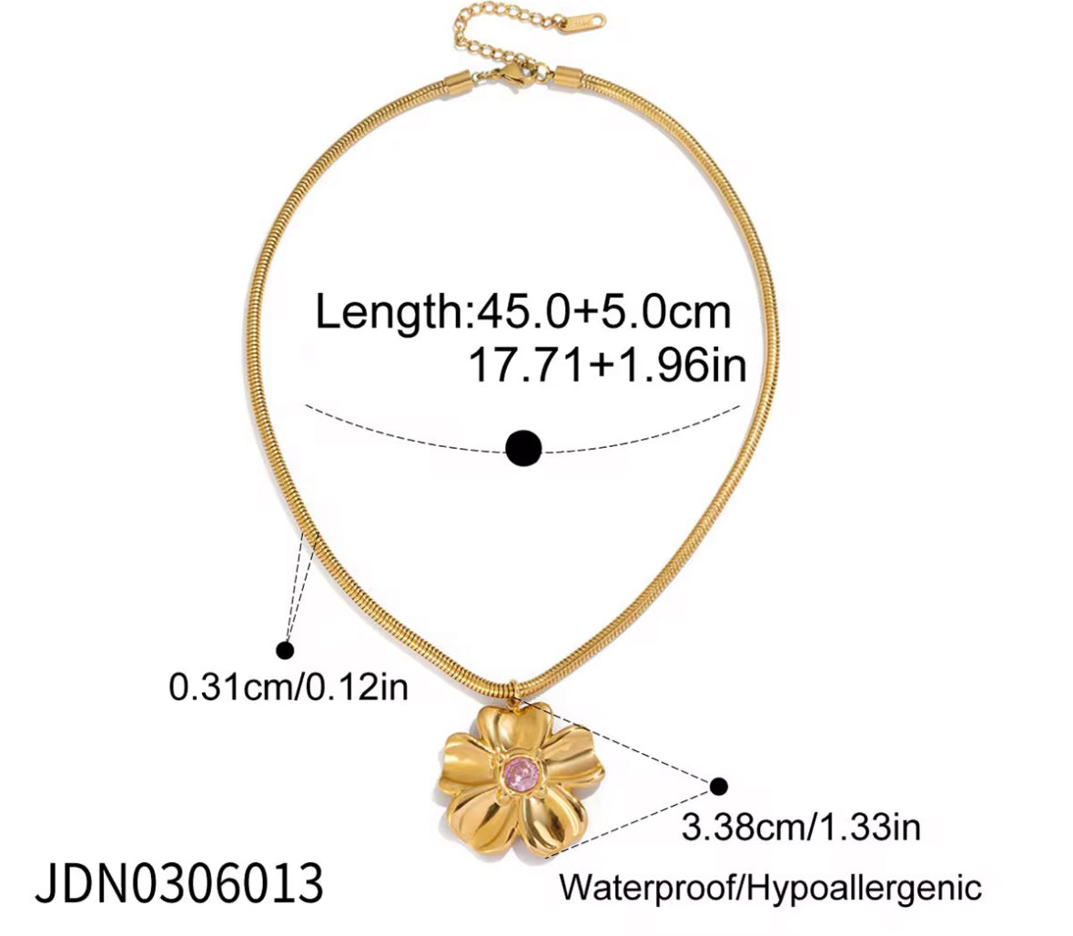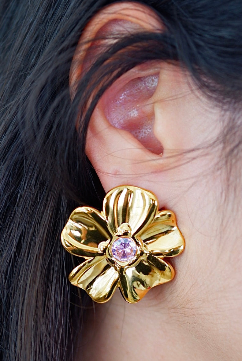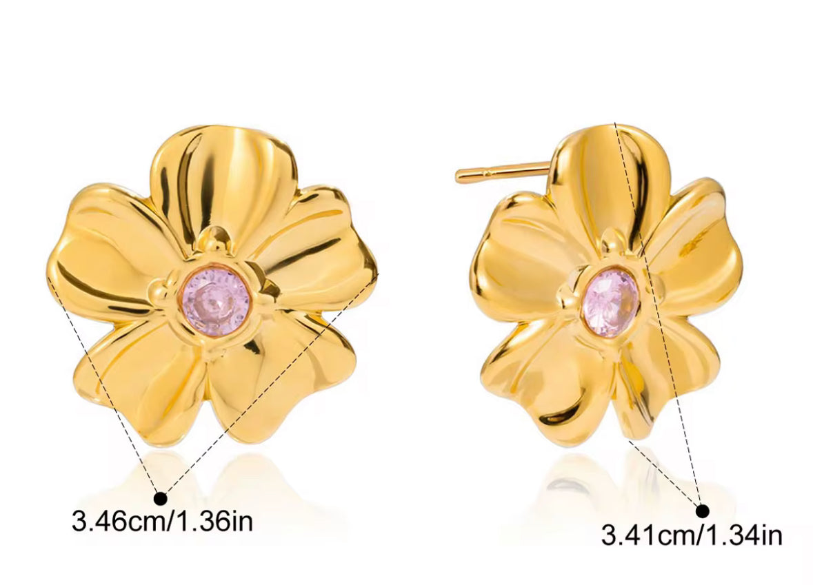 Set elegante y femenino que destaca por su flor grande en acabado dorado, con un delicado detalle central de zirconia rosada que aporta un toque de brillo y sofisticación. Ideal para quienes buscan un look llamativo y armonioso, perfecto para ocasiones especiales o para elevar un outfit diario con estilo y color.
