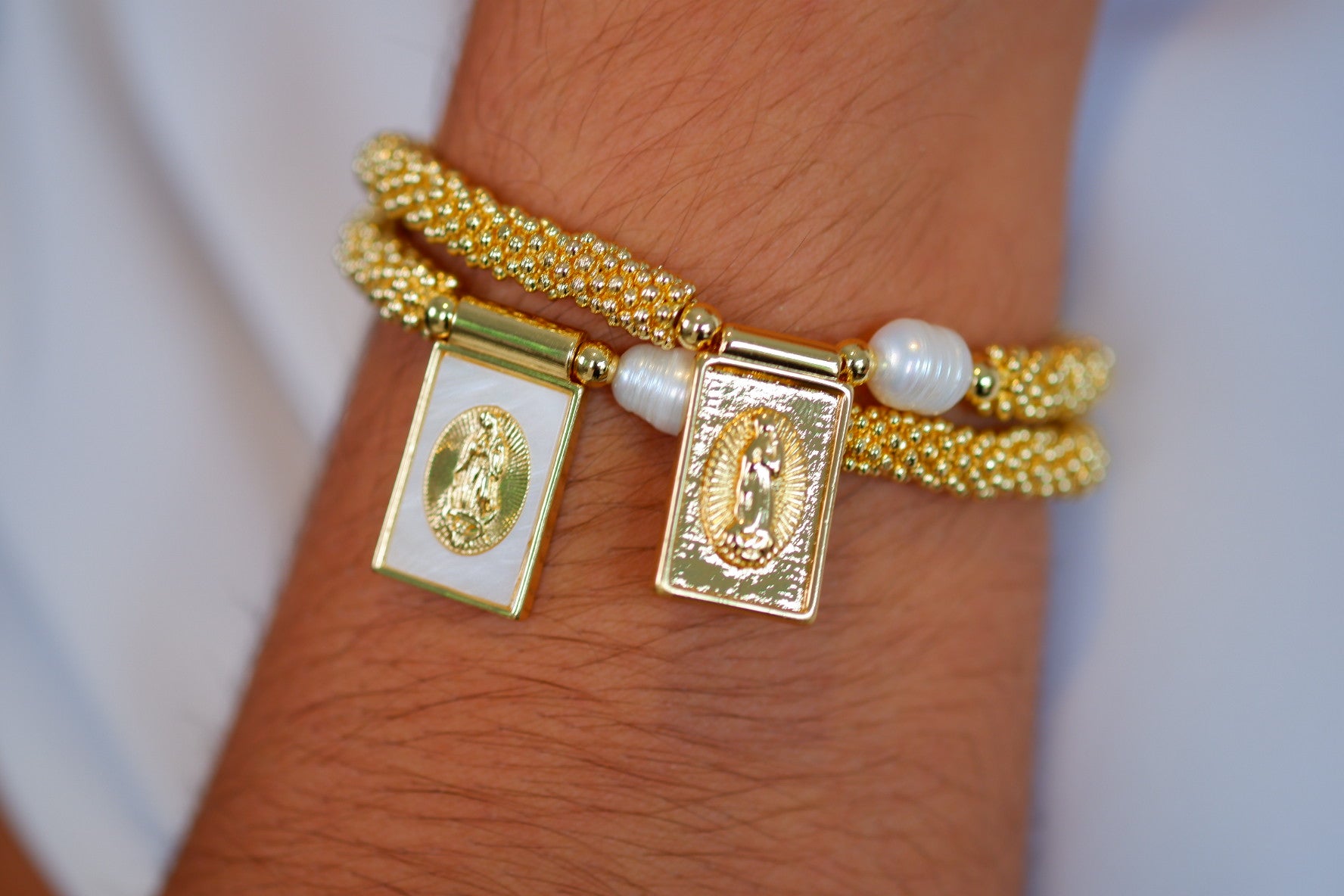 Una joya de fe y delicadeza. Estas pulseras combinan las medallitas de la Virgen de Guadalupe con una perla de río natural, creando un diseño que equilibra lo espiritual con lo elegante. Ideal para llevar contigo una protección sutil todos los días, con un toque femenino y especial.